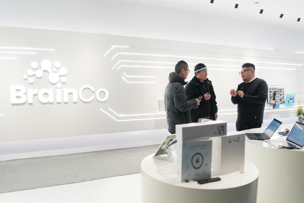 浙江强脑科技有限公司创始人韩璧丞(右一)与团队技术人员讨论产品设计(2月26日摄)。新华社记者 黄宗治 摄