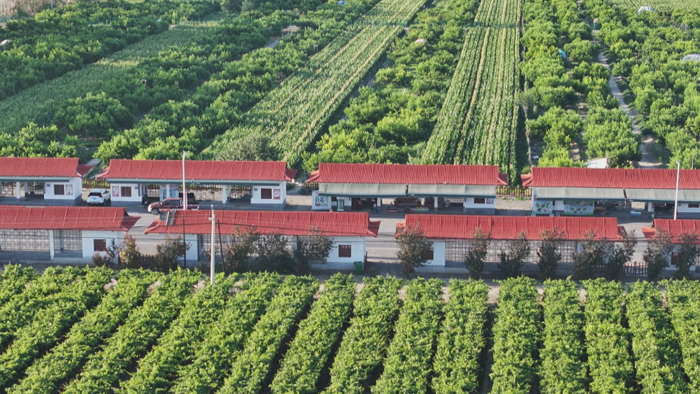 新疆生产建设兵团第八师石河子市一四三团九连,桃园绿意盎然,头戴草帽的果农在林荫下忙活。