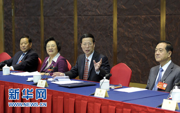 3月4日,中共中央政治局常委、全国人大常委会委员长张德江看望出席全国政协十二届二次会议的港澳地区委员并参加讨论。 新华社记者 李涛摄