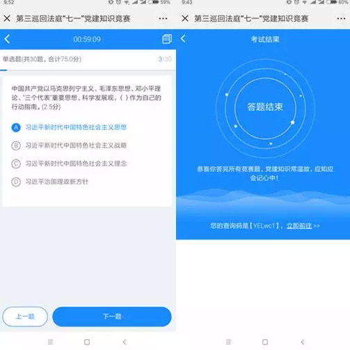 虽然7月1日是周末,但是全庭干警,尤其是党员同志们表现出了高度的热情和积极性。考试设置可在一天内任意时间段答题,让干警们自由掌握答题时间。考试开始后,大部分干警都完成了答题。全庭共有74名干警参与,其中46名党员同志全部参与竞赛。