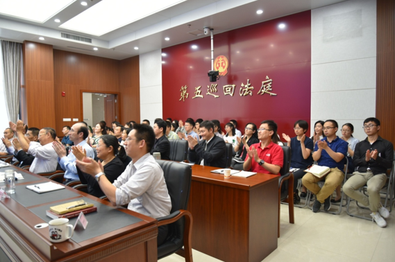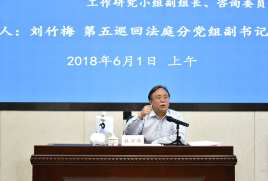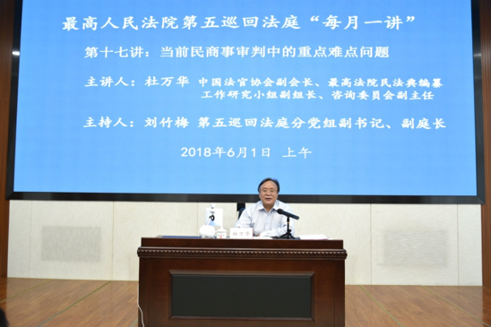 6月1日上午,中国法官协会副会长、最高人民法院民法典编纂工作研究小组副组长、咨询委员会副主任杜万华同志,应邀为第五巡回法庭“每月一讲”集体学习2018年第五讲(总第十七讲)专题讲授“当前民商事审判中的重点难点问题”。第五巡回法庭分党组副书记、副庭长刘竹梅主持讲座。五巡副庭长万永海及其他全体同志参加学习,巡回区内五省区(市)三级法院从事民商事审判工作的干警通过视频会议系统收看。