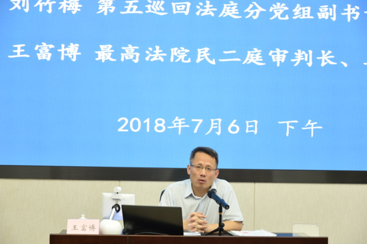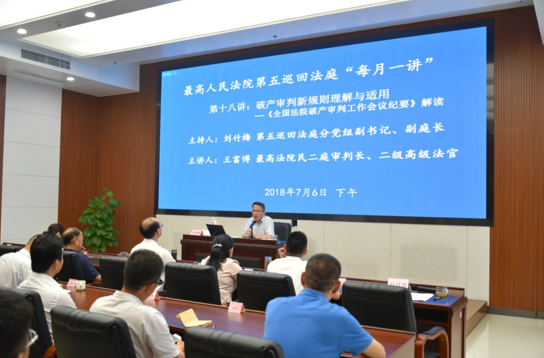 7月6日下午,第五巡回法庭举办“每月一讲”集体业务学习2018年第六讲(总第十八讲),特邀最高人民法院民二庭审判长、二级高级法官王富博专题讲授“破产审判新规则理解与适用——《全国法院破产审判工作会议纪要》解读”。五巡分党组副书记、副庭长刘竹梅主持讲座,副庭长万永海及全庭同志参加学习。巡回区地方三级法院从事民商事审判工作的干警通过视频会议系统收看。