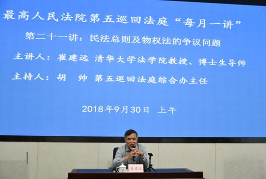 9月30上午,最高人民法院第五巡回法庭举办“每月一讲”集体学习活动2018年第9讲(总第21讲),特邀清华大学法学院教授、博士生导师崔建远专题讲授“民法总则及物权法的争议问题”。五巡综合办主任胡帅主持。