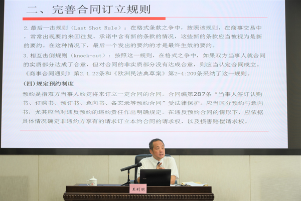 王利明教授作为民法典编纂工作的深度参与者,结合理论研究与司法实践,系统阐释了民法典合同编涉及的合同法与债法总则的关系、合同订立规则、先期谈判中的允诺能否视为合同条款、合同效力、合同履行制度、情事变更制度、不安抗辩权与预期违约之间的关系、合同解除制度、违约责任规则、合同法分则的若干问题等十项重大疑难问题,并详细解答了干警的提问,为第五巡回法庭及西南地区法院干警提供了一份丰盛的精神食粮和知识大餐。