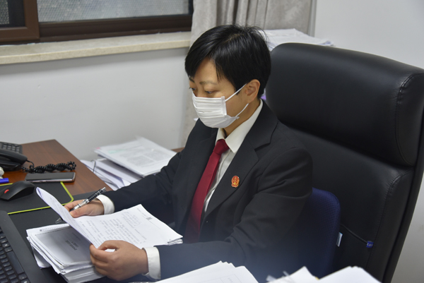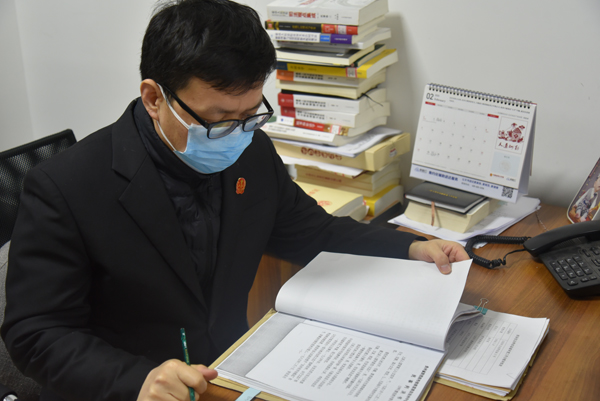 法官助理仇彦军正在认真查看案件的相关证据材料。