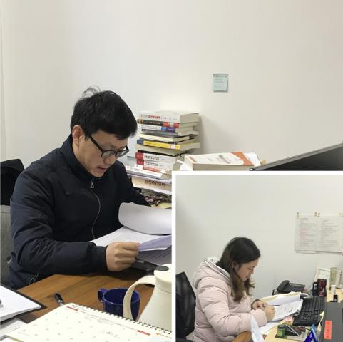 主审法官杨军、乐敏正在认真梳理案件相关信息