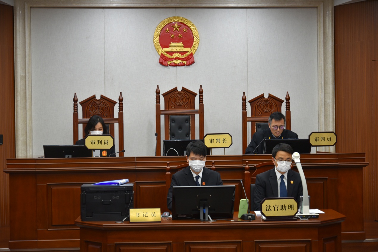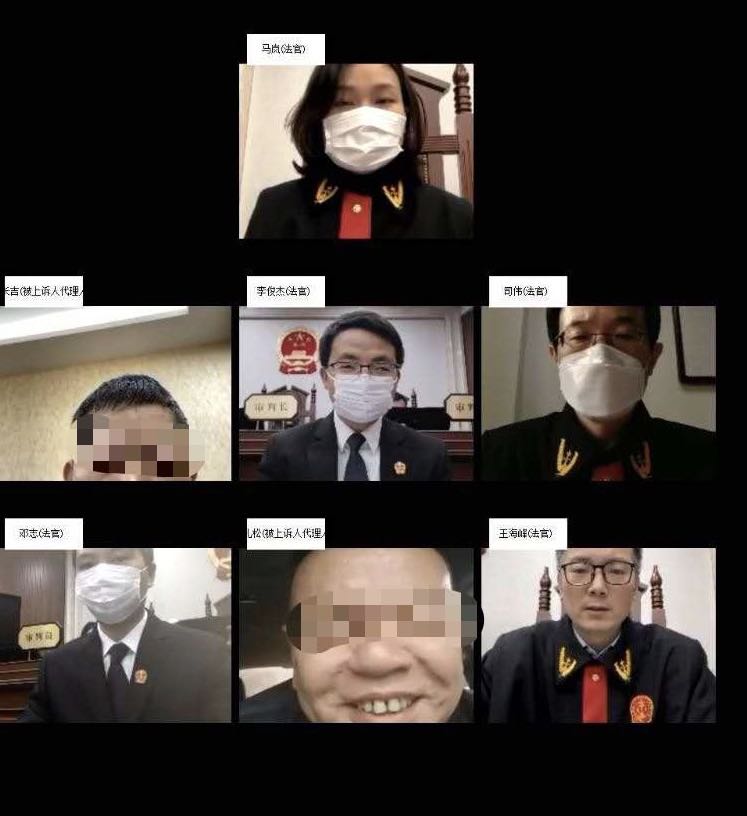 图为第五巡回法庭正在开庭。右一为审判长王海峰,还有一位合议庭法官在家抱病参加庭审