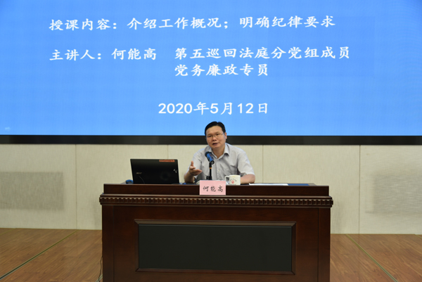 第五巡回法庭分党组成员、党务廉政专员何能高详细介绍了最高人民法院和第五巡回法庭的基本概况、机构设置、党建队建、案件办理、司法改革等情况。他表示,第五巡回法庭成立以来,在院党组和周强院长、李少平副院长的正确领导下,始终坚持把政治建设摆在首位,结合实际创造性开展党建工作,狠抓党风廉政建设,坚持执法办案第一要务,全面践行司法改革创新举措,努力为巡回区经济社会高质量发展提供有力司法服务和保障,积累了一些可复制、可推广的经验。他表示,参训人员要尽快转变工作角色,熟悉适应工作岗位,认真跟案学习,把自己融入五巡大融炉,不断增强五巡人的荣誉感、责任感和使命感;要依法行使职权,依法开展审判工作,潜心钻研办案技巧,做深做实做细做亮每一个案件,铁肩担道义,妙手写判决;要深刻汲取法院系统违法违纪案件教训,扎紧自律篱笆,做一名心中有事业、存法纪、知敬畏的合格干警。他最后以《巡回办案》为题与借调干部共勉:清风明月总相连,严寒酷暑只等闲。回眸巡回波澜起,激扬公义正当年。