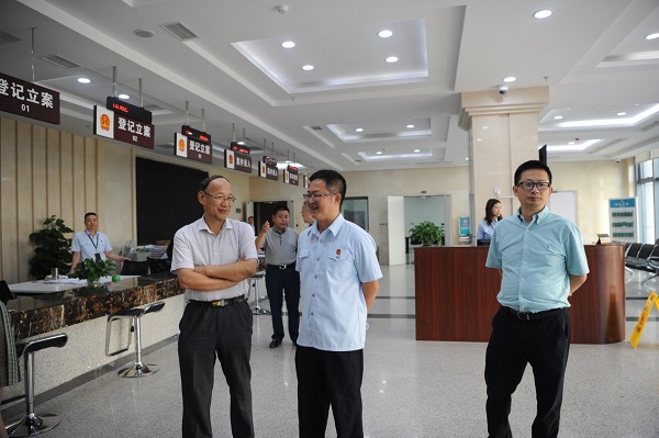 刘竹梅一行参观了南岸区法院诉讼服务中心、“家事”调解室、安保监控室,并就诉讼服务中心的建设、运行情况与南岸区法院相关负责同志进行了座谈。