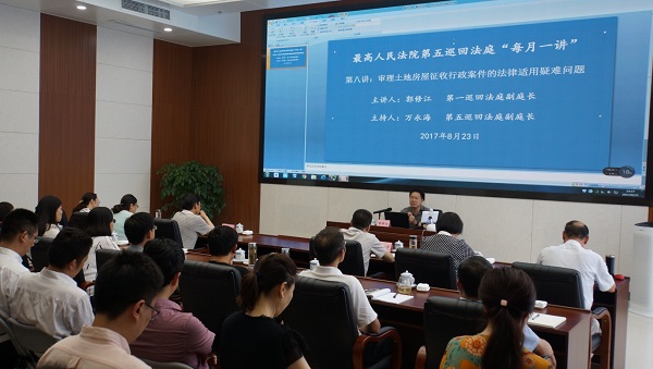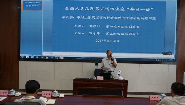 8月23日下午,第五巡回法庭举办“每月一讲”集体学习第八讲,特邀第一巡回法庭副庭长郭修江就“土地房屋征收与补偿行政案件有关疑难问题”进行专题讲座。五巡分党组成员、副庭长万永海主持讲座。五巡巡回区内重庆、四川、贵州、云南、西藏五省(市、区)三级法院从事行政审判工作的干警通过视频会议系统收看。
