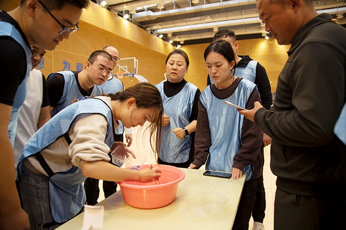 筷子夹球是一项创新挑战,参赛队员被要求原地旋转5圈后,用筷子从水盆中夹起玻璃球,最终以数量取胜。玻璃球遇上水后更加光滑,此项目是平衡与协调能力的挑战,更是心理上的挑战,如何在最短时间内克服紧张情绪,在压力下保持冷静,不断尝试并在比赛过程中找到窍门,成功做到夹起玻璃球,完成挑战。