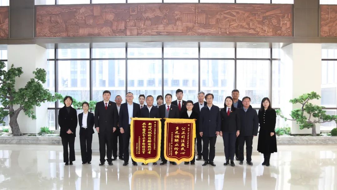 图为在宁夏永宁县人民政府与某公司民事调解书签收仪式后,双方代表向六巡法官赠送锦旗。