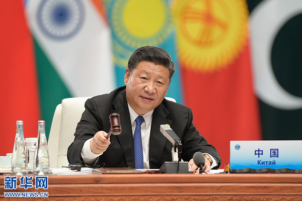 6月10日,上海合作组织成员国元首理事会第十八次会议在青岛国际会议中心举行。国家主席习近平主持会议并发表重要讲话。 新华社记者丁林摄