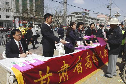 4月22日上午,2011年甘肃省知识产权宣传周活动在定西市正式启动,甘肃省高级人民法院、甘肃省知识产权局等25个单位在主会场参加启动仪式。甘肃省、定西市和安定区三级法院分别在广场设立咨询台,散发宣传资料20000余份,接受公众咨询,讲解知识产权法律法规,为尊重知识产权、保护自主创新奠定了群众基础。(供稿单位:甘肃省高级人民法院 作者:王智纲 贺晨)