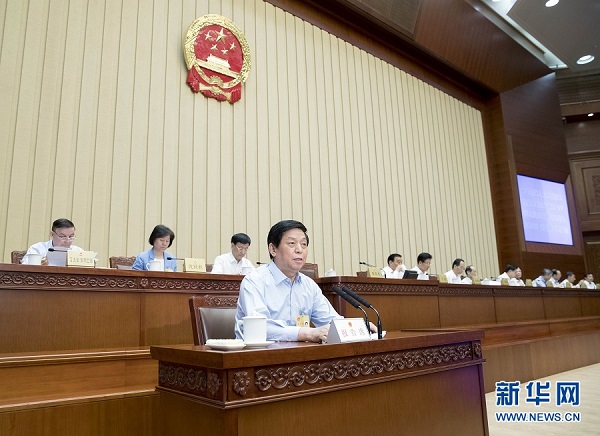 7月9日,十三届全国人大常委会第四次会议在北京人民大会堂举行。栗战书委员长主持会议并作全国人大常委会执法检查组关于检查大气污染防治法实施情况的报告。 新华社记者王晔摄