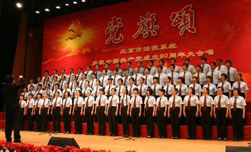6月10日,一首首嘹亮的红歌在北京市高级人民法院大法庭内唱响,近2000名首都法院法官用歌声送上对中国共产党90周年生日的祝福,表达着对人民司法事业的无限忠诚。图为北京市高级人民法院法官表演红色歌曲大联唱。(供稿单位:北京市高级人民法院 作者:赵岩)