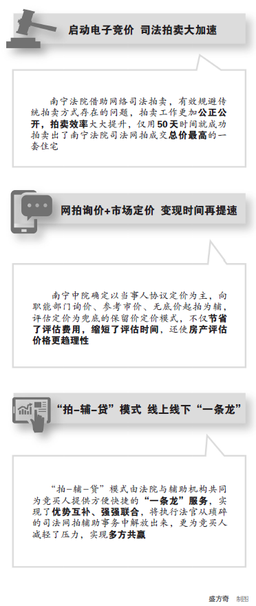 “南宁市在自治区率先探索网络司法拍卖,建立了‘以网拍为常态、传统拍卖为例外’的工作机制,全市网络司法拍卖覆盖率达100%,为两级法院打赢‘决胜执行难’战役提档加速。”南宁市中级人民法院院长张培健说。