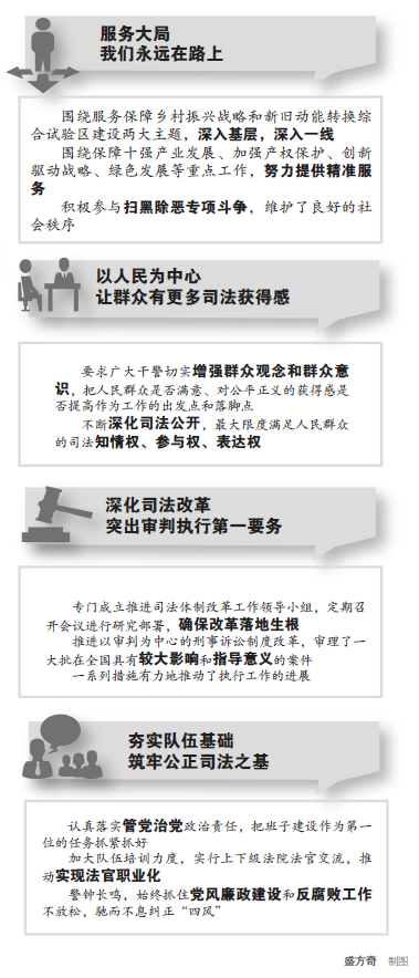 山东高院新一届党组坚持把法院工作置于经济社会发展全局中来谋划推进,着力提升司法水平。山东高院党组书记、院长张甲天强调:“全省各级法院和法院领导干部必须牢记习近平总书记嘱托,把走在前列作为长期坚持的目标定位,努力做到思想再解放,改革再深入,工作再抓实,努力为全省经济社会发展提供有力的司法保障。”