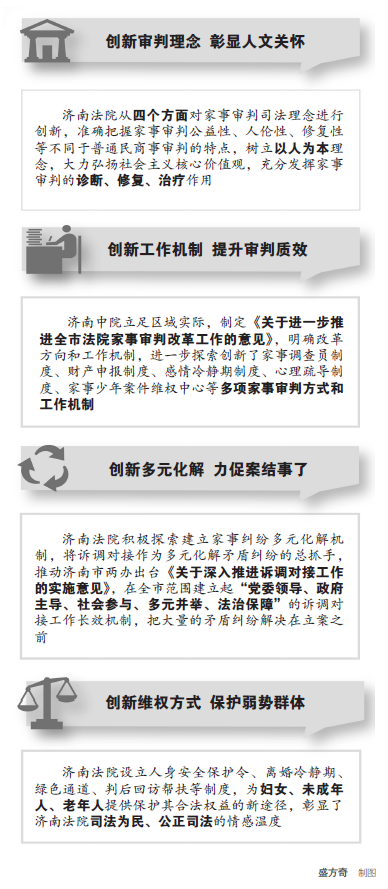 准确把握家事审判公益性、人伦性、修复性等不同于普通民商事审判的特点,树立以人为本理念,大力弘扬社会主义核心价值观,充分发挥家事审判的诊断、修复、治疗作用,济南市两级法院重点从四个方面对家事审判司法理念进行创新。