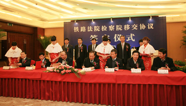 1月20日,陕西省委、省政府在西安人民大厦举行西安铁路两级法院移交签约仪式。省委常委、常务副省长娄勤俭、省法院、省检察院、省委组织部、省编办、省财政厅、省发改委、省人力资源和社会保障厅、西安铁路局等单位相关人员出席移交协议签约仪式,铁道部应邀派员出席。