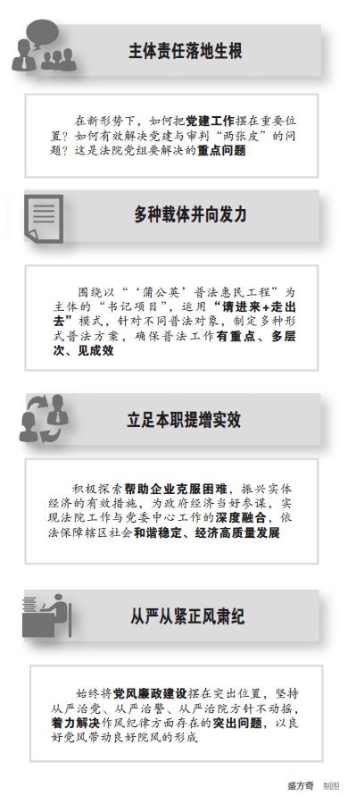“一段时间,法院重业务、轻党建问题依然存在,党建与审判‘两张皮’现象依然;同时,司法规范化、精细化要求越来越高。”采访中,镇江市丹徒区法院院长汤国生介绍说,在这种情况下,如何把党建工作摆在重要位置?如何有效解决党建与审判“两张皮”的问题?这是该院党组要解决的重点问题。