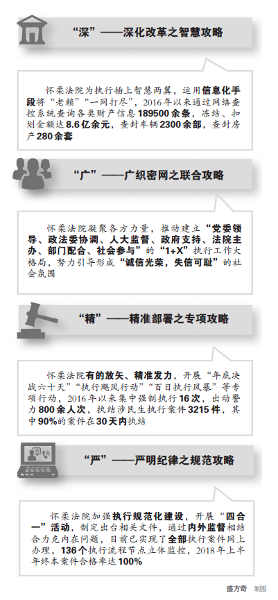 “精感石没羽,岂云惮险艰。”自最高人民法院落实中央部署提出“用两到三年时间基本解决执行难问题”以来,北京市怀柔区人民法院以背水一战的气概和敢打必胜的决心,广泛凝聚执行合力,不断优化执行模式,全面规范执行行为,持续加大执行力度,以“深、广、精、严”四字攻略吹响决战决胜“基本解决执行难”的冲锋号。