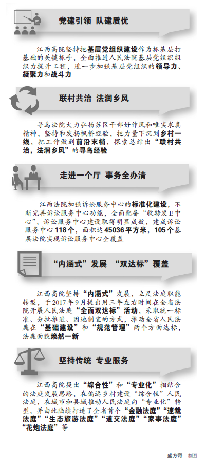 为推进人民法庭建设,江西高院坚持“内涵式”发展,立足法庭职能转型,于2017年9月提出用三年左右时间在全省法院开展人民法庭“全面双达标”活动。采取统一标准、分批推进、因地制宜的方式,推动全省人民法庭在“基础建设”和“规范管理”两个方面达标。