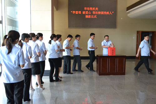 5月16日,河南鹤壁市中级法院开展了一次“学雷锋 献爱心 帮扶特困残疾人”活动,全院干警积极踊跃,纷纷献上了自己的一份爱心,短短半个小时的时间,就捐款近万元。 近年来,鹤壁中院积极开展关爱残疾人、结对帮扶、代理家长等送温暖活动,先后为残疾人、留守儿童、孤寡老人等捐助现金和各项物资共计10万余元。(供稿单位:河南省高级人民法院 作者:李瑜 程世勇)