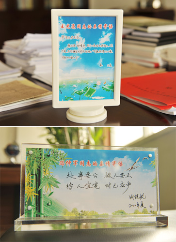 8月9日,河南鹤壁中院统一制作的“守廉、尚德”亲情寄语牌摆上了每个干警的办公桌上,用亲情鞭策干警守廉洁之门,筑廉洁防线,这是鹤壁中院创新廉政教育形式,丰富廉政文化建设载体的又一项新举措。