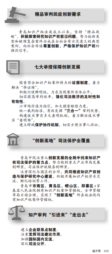 青岛中院注重从创新发展的全局中找准知识产权司法保护的着力点,努力做到重点产业布局发展到哪里,司法保护就服务到哪里。