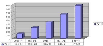 2013年至2017年农地承包经营权流转合同案件诉讼标的额总计2365.78万元,其中2013年124.8万元,2014年289.73万元,2015年432.35万元,2016年641.7万元,2017年877.2万元,呈现逐年上升的趋势(见图一),也表明案件处理结果牵涉到经营权人的切身利益和农村土地流转的健康发展,处理难度较大。