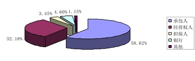 在抽样案件中,承包人为被告的案件占58.62%,经营权人为被告的案件仅占32.18%。此外,还包括担保人、银行、农村集体经济组织等被告类型。可见,此类案件的被告以经营权人和承包人居多,二者占比在90%以上。(见图二)