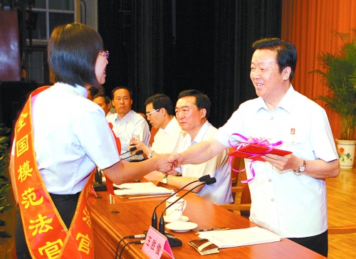 王胜俊向任秋华颁发“全国模范法官”证书。