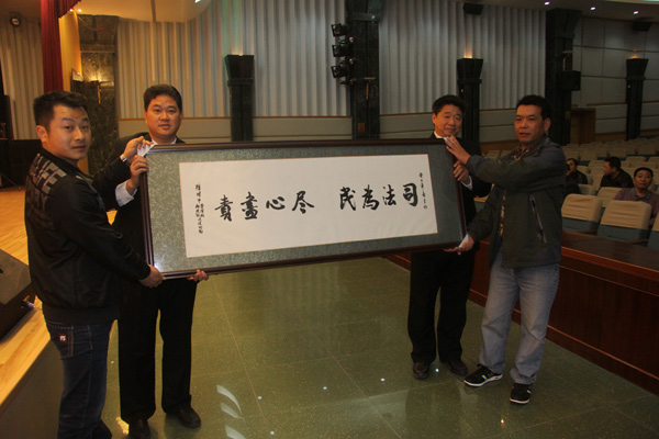 3月19日,广西壮族自治区桂林某汽运公司50余名职工代表将一面写有“司法为民,尽心尽责”的牌匾和一封感谢信送到桂林市中级人民法院,感谢该院执行法官依法为他们执行该公司拖欠其130余名职工大部分风险保证金及工资300万元。(单位:广西壮族自治区桂林市中级人民法院 作者:余作才)
