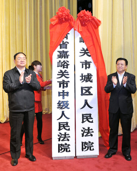 3月27日,甘肃省高级人民法院院长梁明远与市委书记郑亚军为甘肃省嘉峪关市中级人民法院和嘉峪关市城区人民法院揭牌