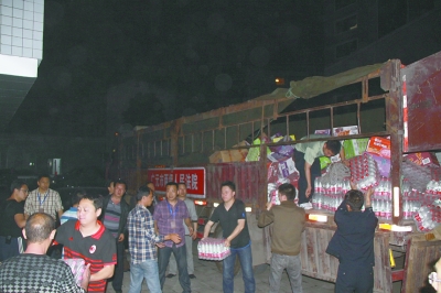 4月21日凌晨,广元法院干警接力卸载救灾物资。何 伟 摄