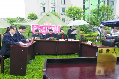 早上,芦山下起了毛毛雨。9时30分,案件准时开庭。由于临时搭建的帐篷法庭暂未解决照明问题,庭审在草坪的空地上进行,法庭为此案的被告人和书记员配了雨伞。