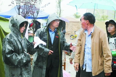 4月23日,芦山法院纪检组长杨顺洪带领法院6名干警,在体育馆安置点为灾民提供服务。姜郑勇 摄