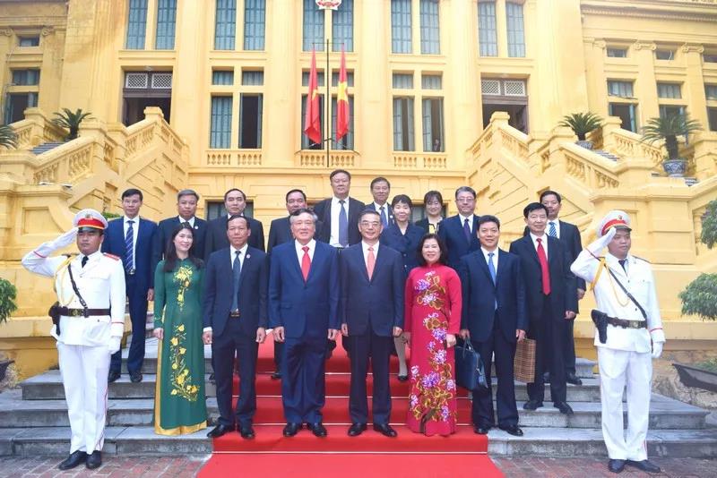 周强与越南最高人民法院院长阮和平等会谈后合影。张艳兵 摄