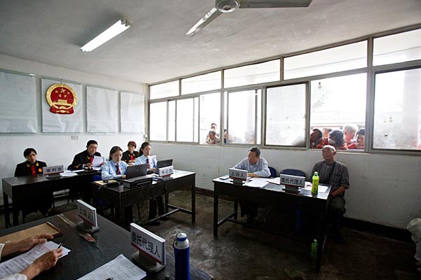 为切实保护当事人的合法权益,承办法官提前到达争议的承包地进行现场勘验工作,对承包地的地理位置和所涉范围进行了细致调查,仔细询问当事人并记录双方意见。随后,庭审在田府村村委会院内的党员活动室举行。闻讯而来的四、五十位村民一大早已在村委会大院内守候,他们对庭审充满了好奇和希冀。法官在临时法庭内安排了尽可能多的椅子让村民就坐旁听,由于场地限制,不能进入法庭旁听的人员只能站立在临时法庭外安静聆听。整个庭审过程规范有序。