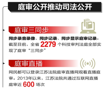 直播庭审让审判更公开透明。庭审直播是江苏法院全面全程推进司法公开的又一重要抓手。2013年以来,江苏法院共通过互联网直播庭审近600场次。庭审直播工作明确,除非涉及当事人隐私、国家机密、商业秘密等依法不公开审理的案件,其余案件尤其是社会关注度较高的重大案件、民生案件,只要条件具备,网民都可以通过江苏法院庭审直播网观看直播庭审。庭审公开推动司法公开,2013年2月中国社科院法学所发布的《中国司法透明度报告(2012)》中,江苏高院司法透明度名列全国高级法院第二位,较2011年前进两个位次。