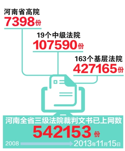 近年来,河南法院系统全面推行裁判文书上网工作。自2008年至2013年11月15日,全省三级法院裁判文书已上网共542153份,居全国之首。其中,河南省高级人民法院7398份,19个中级法院107590份,163个基层法院427165份。