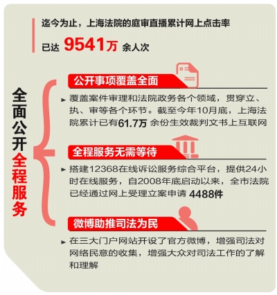 公开事项覆盖全面。上海法院将公开事项横向覆盖刑事、民事、行政、政务各领域,纵向贯穿立案、审判、执行、涉诉信访等诸环节,涵盖程序和实体两个方面。从2000年起,逐步实现庭审同步录音录像全程化、庭审网络直播常态化、生效裁判文书上网常规化、公众查阅诉讼档案网络化、审判白皮书发布系列化和新闻发布经常化。截至今年10月底,累计已有61.7万余份生效裁判文书上互联网,接待社会公众查阅电子诉讼档案8万余件次。