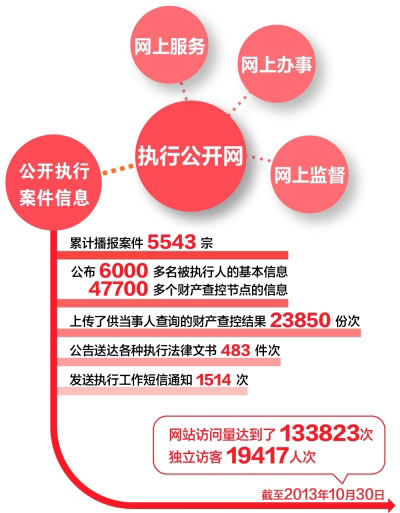 目标明确,最大限度促进公开。罗湖法院执行公开网的核心目标就是要借助互联网的实时性、全民性、互动性,最大限度地实现执行工作的全过程公开。除为防止被执行人转移财产等个别案件外,罗湖法院将所有执行案件的财产查询、控制、处分、程序流转等基本情况都在网上即时公开,方便当事人了解案件执行情况和具体的财产查控、处分信息。截至2013年10月30日,罗湖法院执行公开网累计播报案件5543宗,公布6000多名被执行人的基本信息、47700多个财产查控节点的信息,上传了供当事人查询的财产查控结果23850份次,公告送达各种执行法律文书483件次,发送执行工作短信通知1514次,网站访问量达到了133823次,独立访客19417人次。