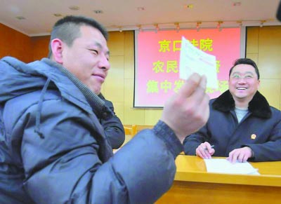 1月21日,在江苏省镇江市京口区人民法院,51名民工终于拿到了被拖欠的工资共计86万多元。民工们高兴地说,这下可以安心回家过年了。