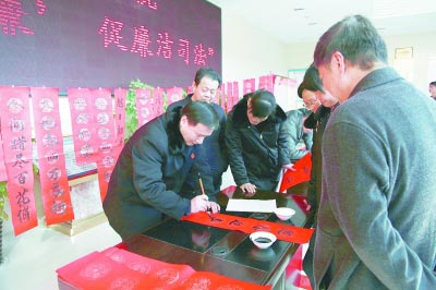 为让干警过一个祥和的“廉”节,1月21日,福建省永安市人民法院组织开展“送贴心春联促廉洁司法”活动,向该院干警及来访的当事人赠送法治春联,传递新春祝福。图为法官现场创作春联赠送给当事人。