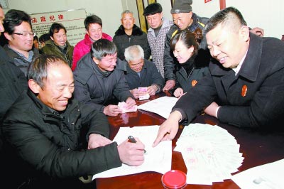 按照最高人民法院涉民生案件专项集中执行活动的部署要求,安徽省淮北市烈山区人民法院决定在春节前集中执行一批拖欠农民工工资等劳动报酬案件以及申请执行人生活极端困难的案件,对涉民生案件实行优先执行、优先分配。图为春节前夕,该院法官向48位农民工集中发放企业拖欠农民工工资款20余万元。朱炳武 摄