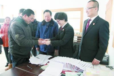 1月28日上午,江苏省江阴市某机电设备有限公司的47名职工从江阴市人民法院临港新城法庭的法官手里领到了总额为1221975元的工资款。图为工资款发放现场。卢凤 摄
