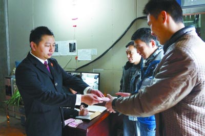 图为杨涛将执行款交给农民工。郭维 摄