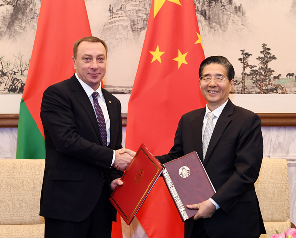 11月2日,中国和白俄罗斯政府间合作委员会第三次会议在北京举行。委员会中方主席、中共中央政治局委员、中央政法委书记郭声琨与委员会白方主席、白俄罗斯总统办公厅副主任斯诺普科夫共同主持。 图为会后,郭声琨与斯诺普科夫签署会议纪要并见证签署有关合作文件。郝帆 摄